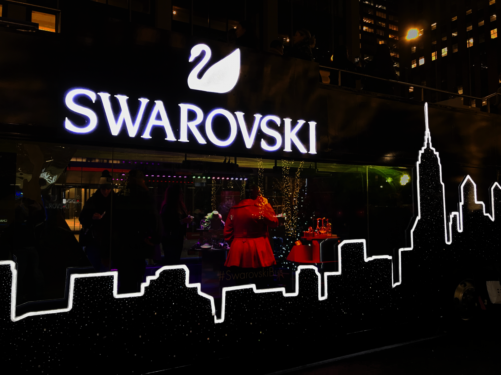 Double-decker Swarovski Holiday Bus, adorned with 350,000 Swarovski crystals (Credit: Store Windows at Fashion Windows)
